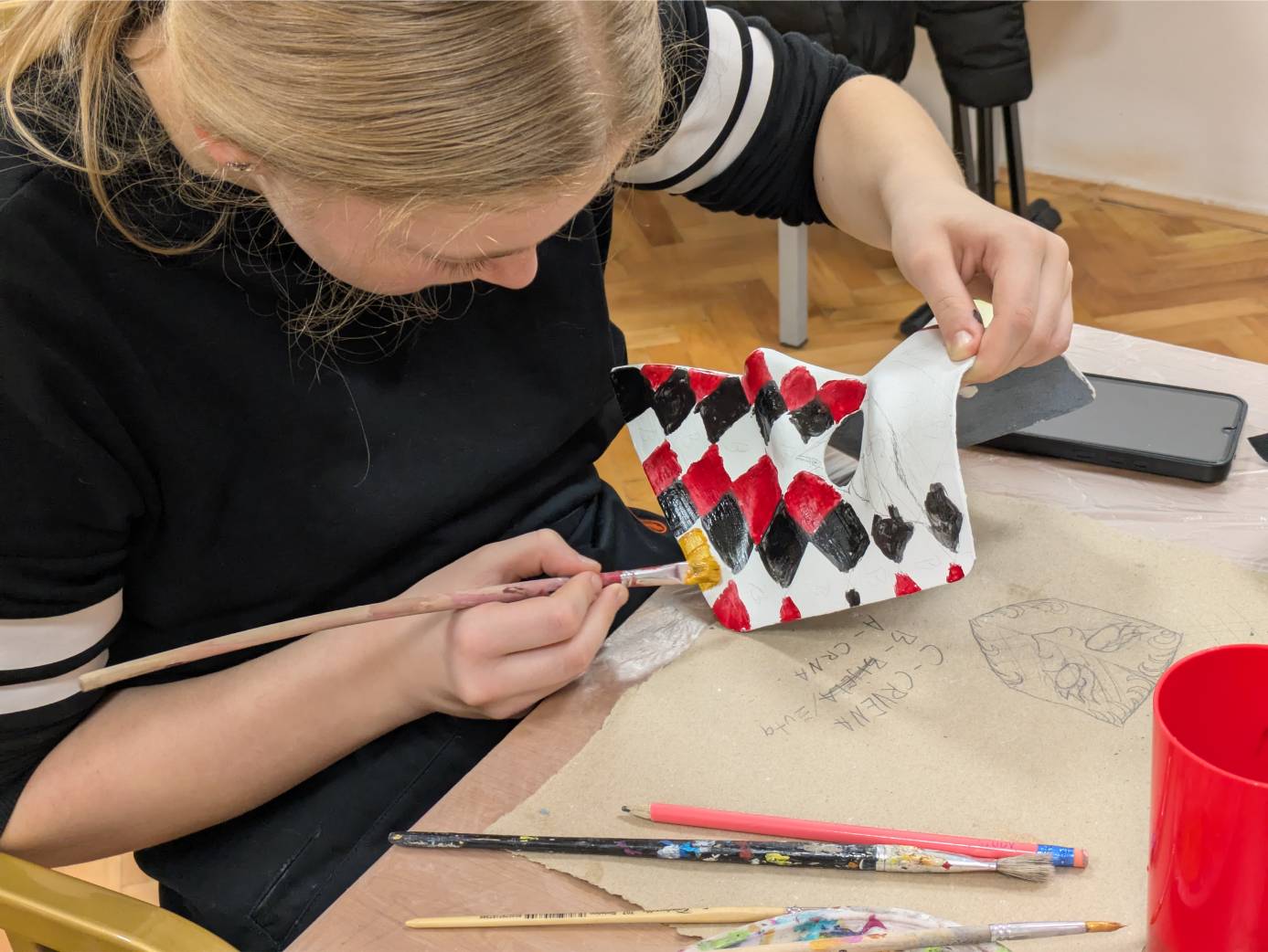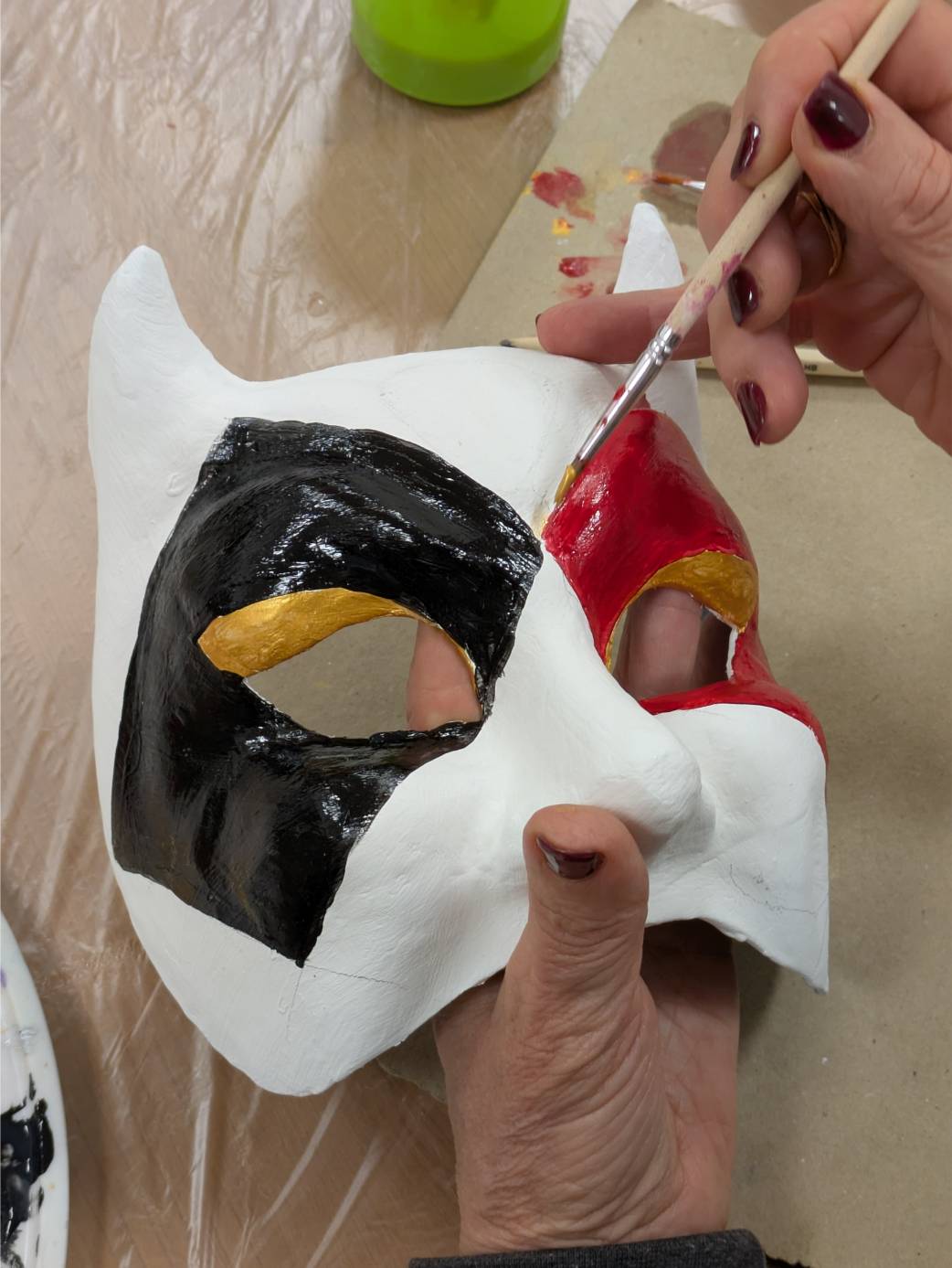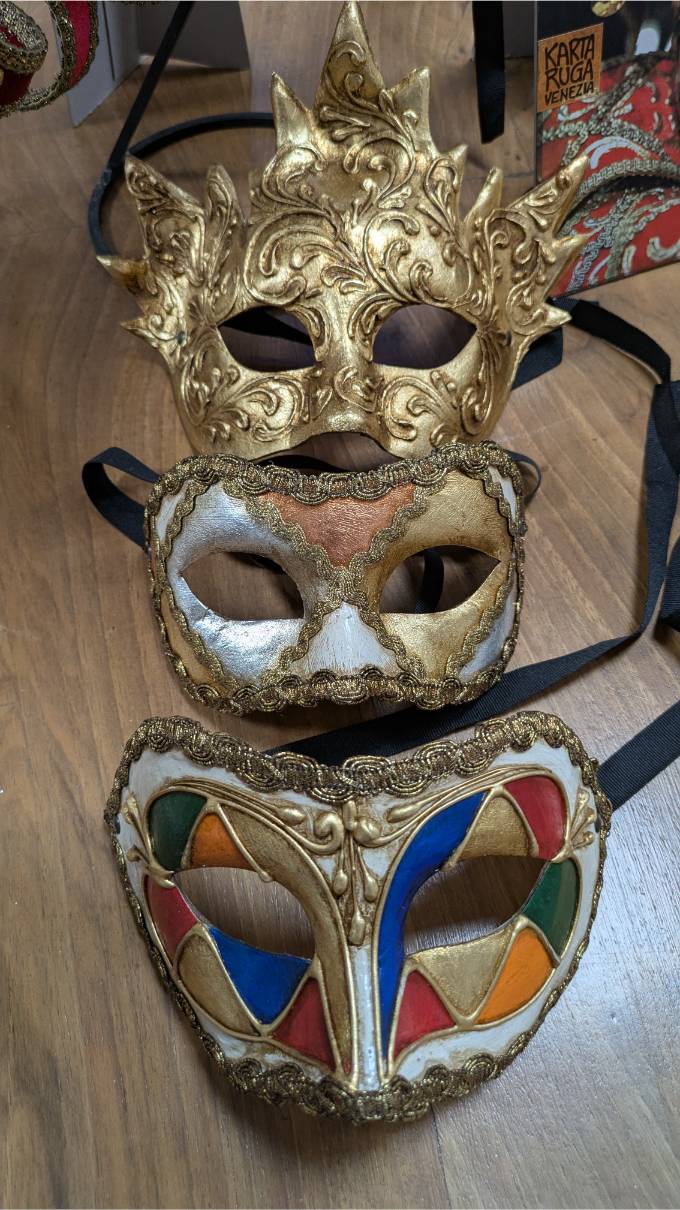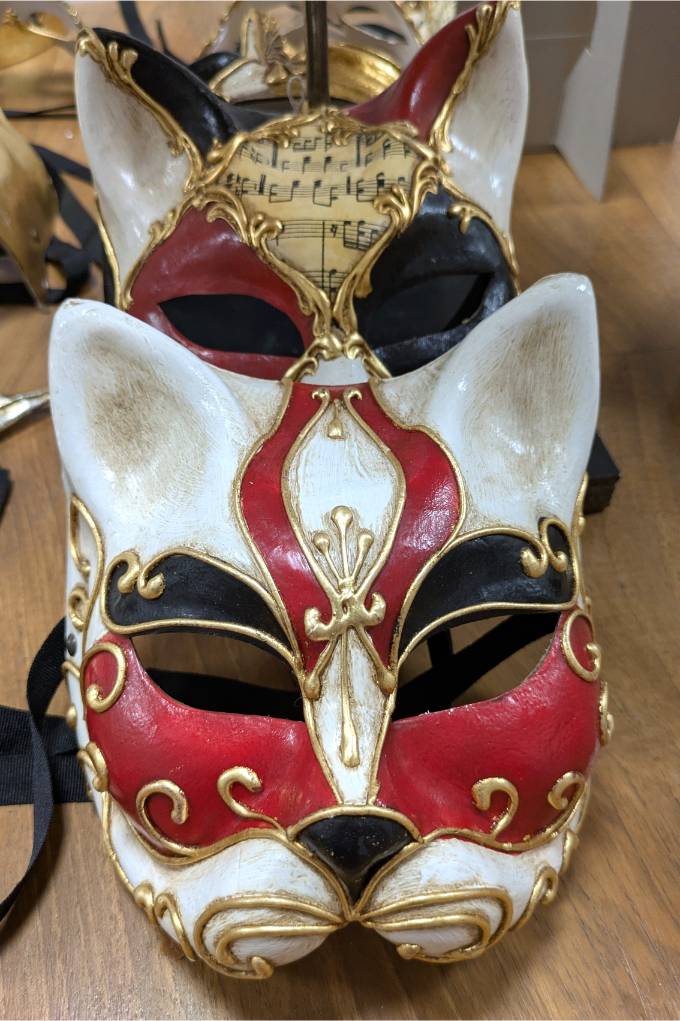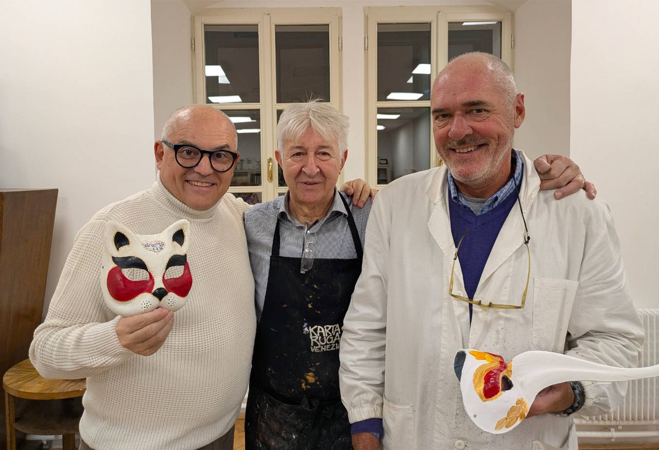 La mostra finale, allestita nella sala principale della Comunità, ha raccolto oltre cinquanta maschere della collezione dell’Atelier Kartaruga di Venezia. Volti classici, interpretazioni moderne, opere di alto artigianato veneziano. Le immagini della galleria fotogratica raccontano l’intensità di queste due giornate tra sorrisi e concentrazione, stupore, mani sporche del lavoro artigiano e un orgoglio palpabile nel mostrare ciò che è stato creato.